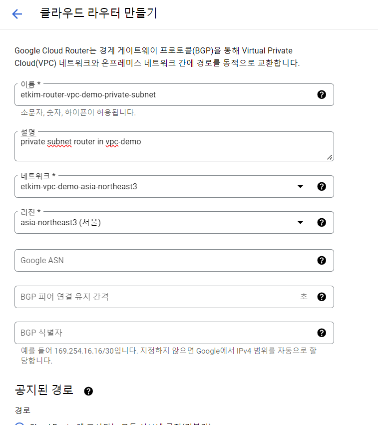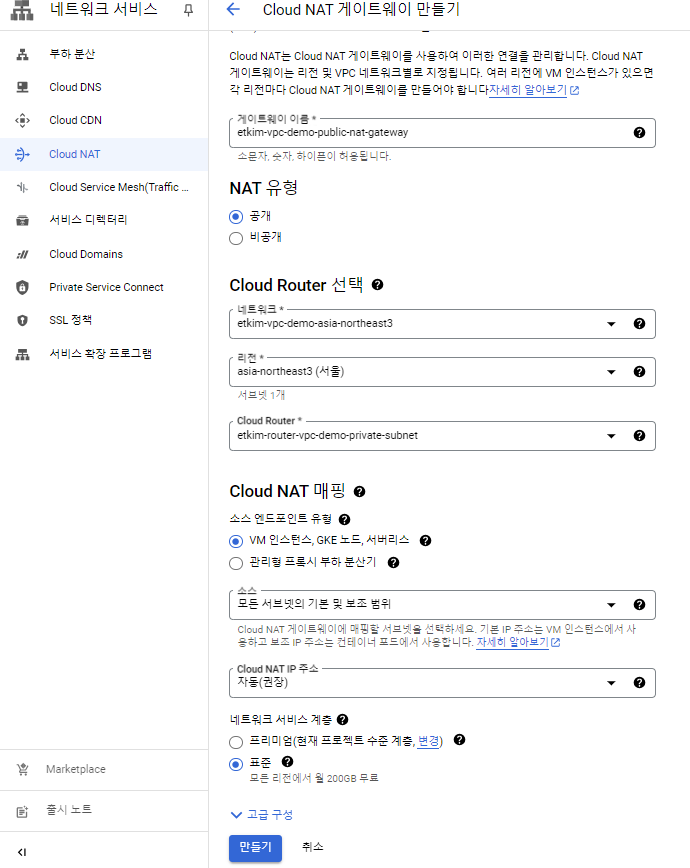 "네트워크"와 "리전"도 Cloud Router 때와 동일하게 설정해주시고, "Cloud Router"는 방금 만든 것으로 설정해주세요.