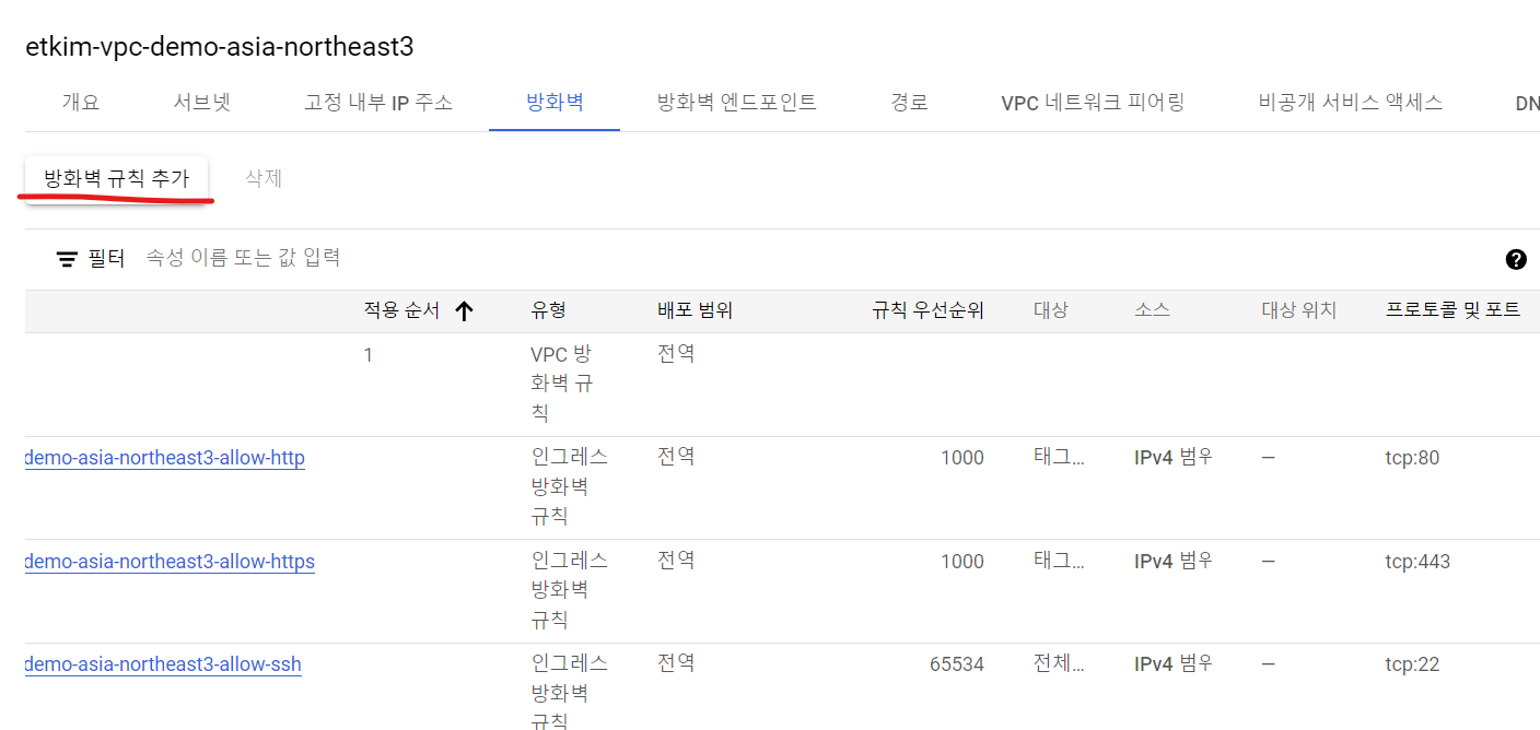 규칙 추가 전에 확인해보면 처음 설정한 allow-ssh 말고도 allow-http, allow-https가 자동으로 설정된 것을 보실 수 있습니다.