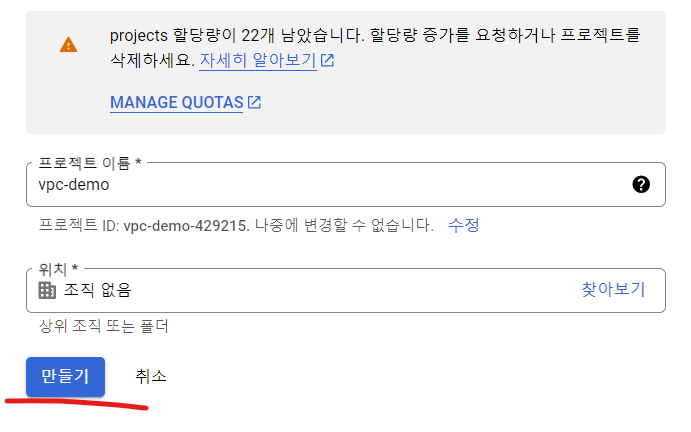 GCP는 프로젝트 단위로 VPC 설정이 가능하기 때문에(물론 shared VPC로 조직 단위에서도 공유 가능) 저는 일단 프로젝트를 새로 만들어 진행하겠습니다.