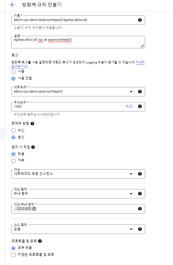 때문에 인그레스는 모두 되어있으니 이그레스(송신)를 설정할 것이고, 송신은 모든 것이 가능하다고 설정할 것이기에 allow-all로 해줍니다.