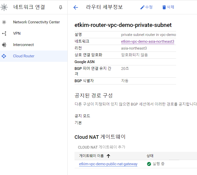 13. 생성 완료 후 "Cloud Router"에서 "Cloud NAT 게이트웨이"가 잘 연결되었는지 확인(잘 되었으면 자동 연동됩니다).
