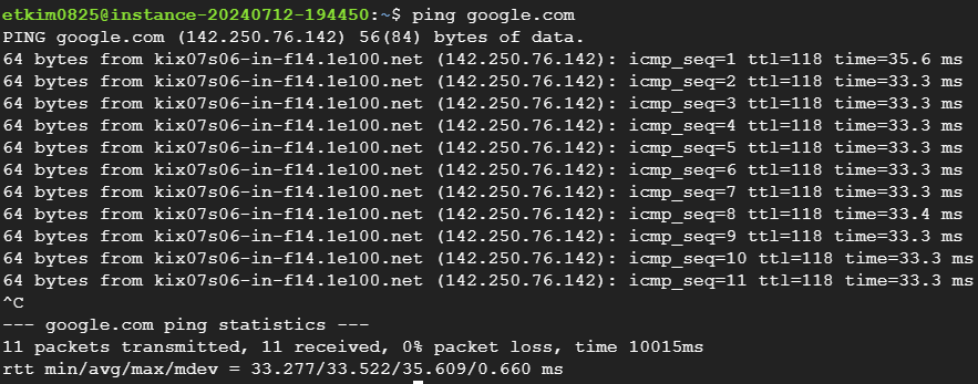 이후 ping google.com을 하면 정상적으로 인터넷 연결이 되었다는 것을 알 수 있습니다.