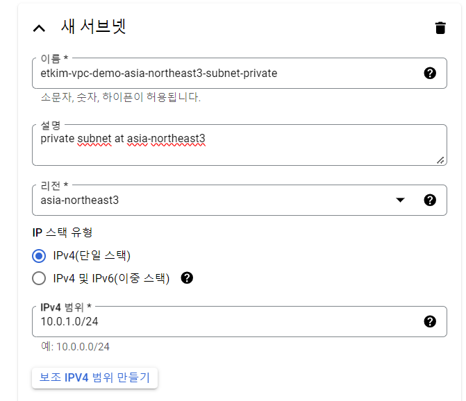 - 리전: 서브넷을 생성할 지역 (서울, 대한민국이 asia-northeast3입니다)
