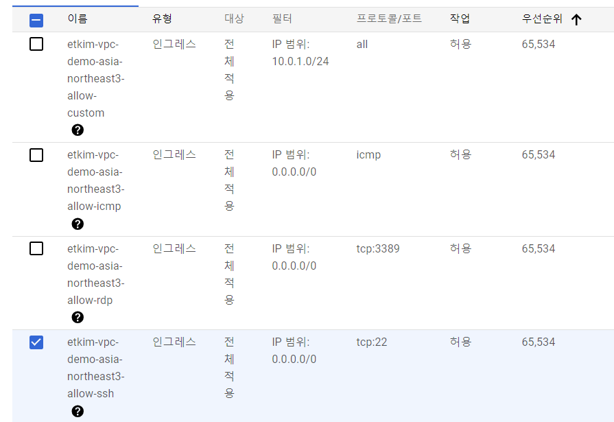 8. 일단 방화벽 규칙 중 인그레스, allow-ssh (tcp:22)만 체크.