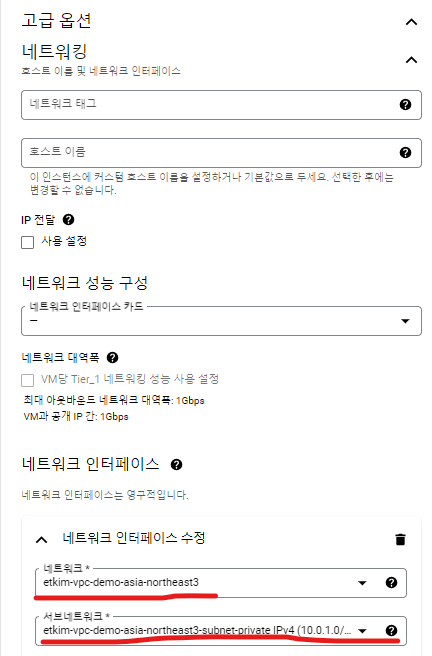 11. 네트워크는 아까 생성한 vpc, 리전은 해당하는 서브넷 쪽 리전(asia-northeast3)으로 설정.
